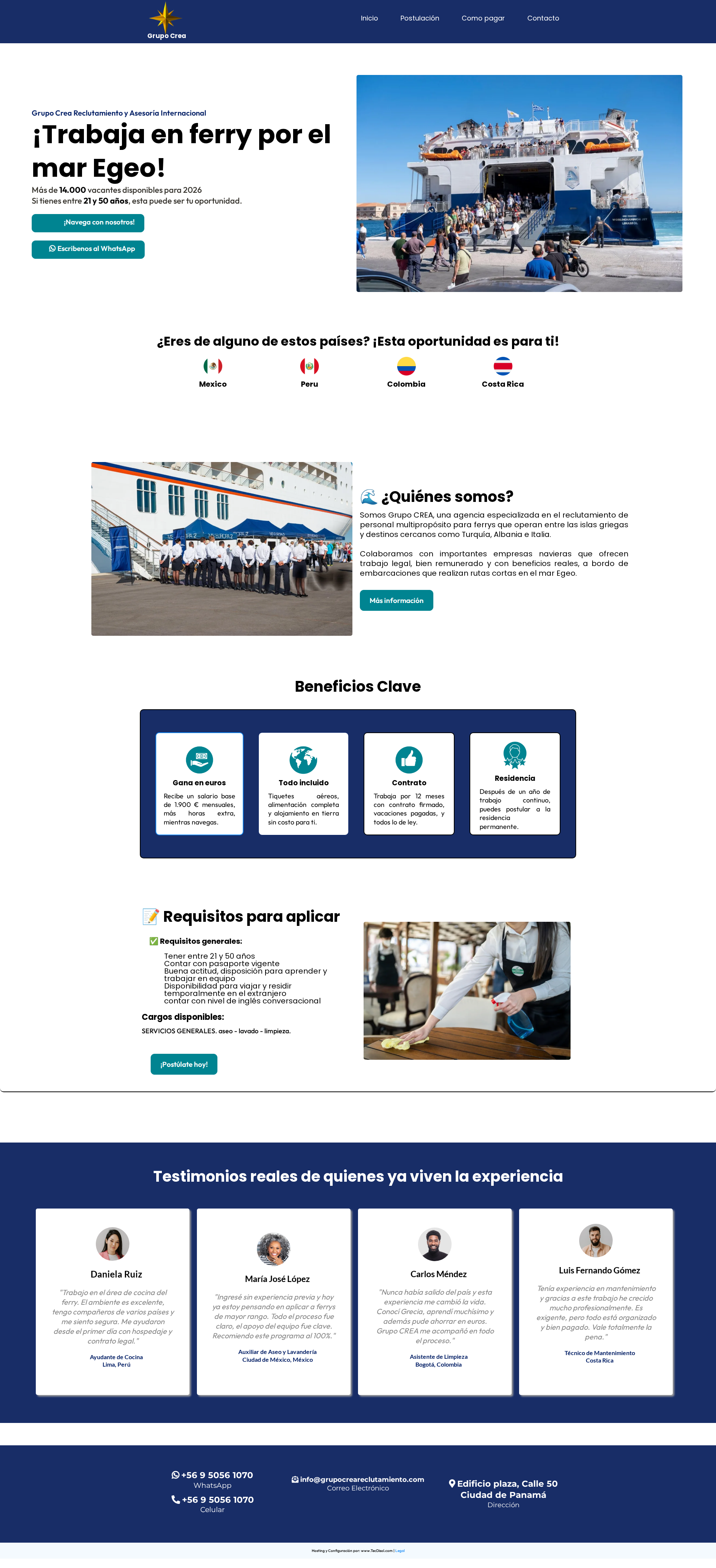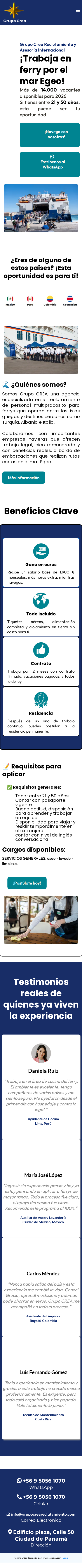 Grupo CREA es una agencia especializada en el reclutamiento de personal multipropósito para trabajar en ferrys que recorren el mar Egeo y conectan con destinos como Grecia, Turquía, Albania e Italia. Su propósito es abrir las puertas a miles de personas que buscan una oportunidad laboral legal, segura y bien remunerada en el extranjero, con todos los beneficios y acompañamiento necesarios para vivir esta experiencia internacional.